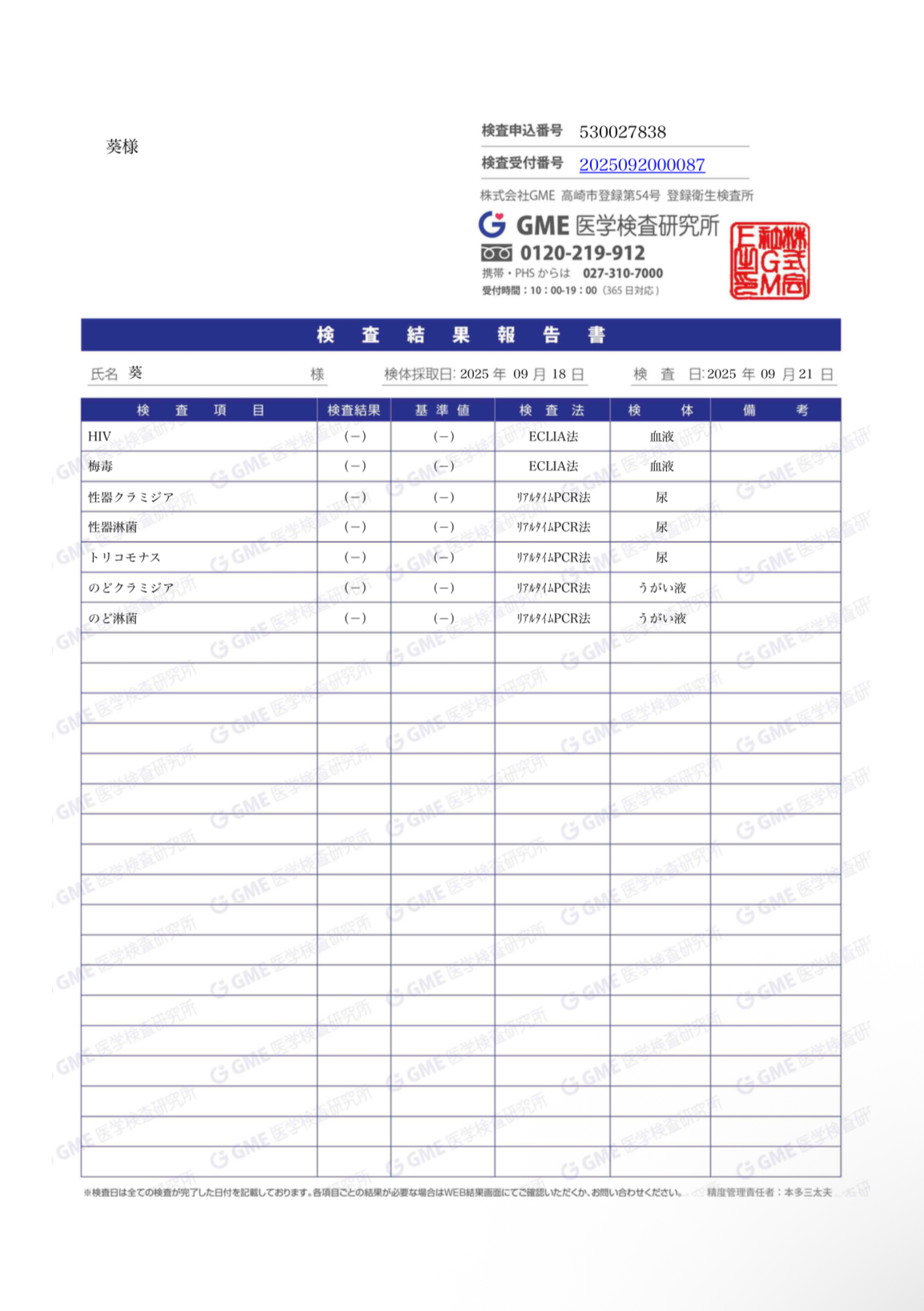 性病検査結果報告